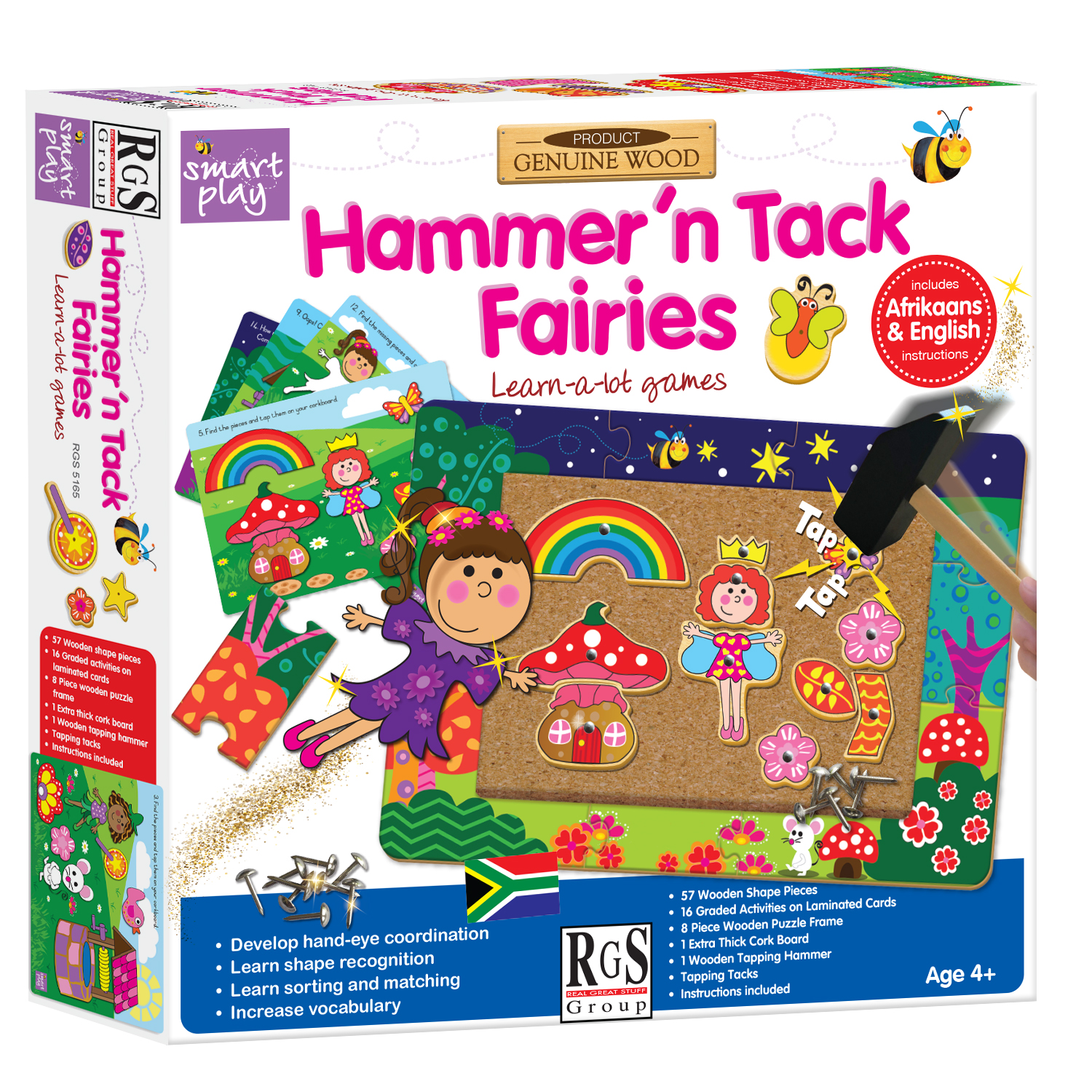 Nuremberg Toy Award Finalist 2020. Hammer ‘n Tack Fairies is a classic pre-school developmental toy with a difference. Children begin by building the beautifully illustrated 8-piece puzzle frame around the corkboard, to set the scene for their designs. Activity guide supplied in both Afrikaans and English. Age 4+.